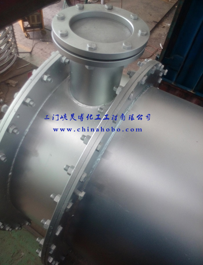 操作人員在換熱器設(shè)備上打上三門峽昊博化工工程有限公司標(biāo)示和電話0398-2918156
