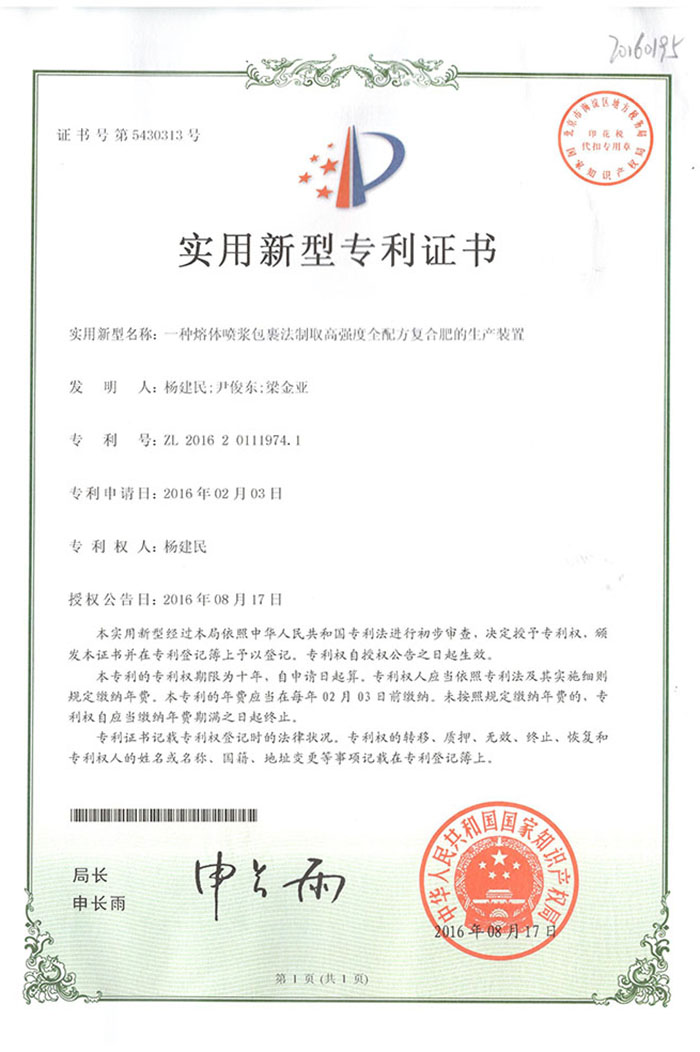 熱烈祝賀我公司又取得一項(xiàng)專利《一種熔體噴漿包裹法制取高強(qiáng)度全配方復(fù)合肥的生產(chǎn)裝置》